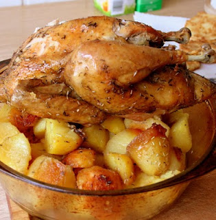 Į skardą sudėti apvirtas bulves ir apvolioti riebaluose, kuriuos išskyrė kepamas viščiukas. Bulves apibarstyti šviežiais rozmarino lapeliais, o į vidurį atgal įdėti viščiuką ir kepti dar 45 min.